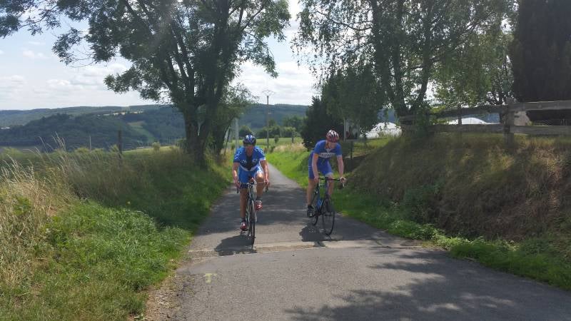 Vandaag staan we weer met 7 man aan het vertrek, de vaste kern. Joshua wil op tijd thuis zijn en gaat maar een stukje mee. Verder heeft de wegkapitein carte blanche. Weer is prima, niet te warm enkel een licht briesje, dus de perfecte omstandigheden voor een ouderwets ritje. Standaard verloop van de eerste koershelft met enkel de beklimming van de Sibbergrubbe, welke we in een aangenaam tempo omhoog fietsen. Vervolgens binnendoor naar Margraten met iets verderop een korte plaspauze. Dan via de provinciale weg richting Planck waar we de grens oversteken. Wind staat op kop en ondanks dat Uge het advies van Christian krijgt om geen kopwerk te doen, neemt hij zijn portie voor zijn rekening, hij is niet bang om iets af te zien. Voor Aubel slaan we linksaf richting Henri Chapelle. Wind staat nu schuin van rechts waardoor waaiervorming mogelijk zou zijn, maar het is nog te vroeg in de koers om alles op de kant te zetten. Bij Henri Chapelle verlaat Joshua de groep, de overige mannen stuiteren verder richting Dolhain. De beklimming, “de Mur” naar Limbourg is eindelijk open zodat Marcel en Nico kennis kunnen maken met dit pittige pukkeltje. Even later volgt de iets langere en minder steile klim vanuit Hevremont welke deels is voorzien van nieuw asfalt, waarschijnlijk hadden ze net niet genoeg geld om hem volledig te asfalteren. Boven aangekomen duiken we via Jehanster naar Polleur waar we ons vastrijden op een wegafzetting. Een vriendelijke Franstalig Belg verteld ons in zijn beste Frans dat we via een klein omwegje de wegversperring kunnen omzeilen. En inderdaad binnen een mum van tijd zitten we weer op de route . Vlak voor Theux draaien we van de weg af een smal wegje in, een onregelmatige en smalle klim volgt even verder nog een uitloper over bredere weg. Vervolgens alweer een superlange rechte afdaling en nu tot net voor Theux. Dan is het weer even zoeken naar het klimmetje richting Tancremont. Nico vertrekt voortvarend en dartelt omhoog. Christian, Pieter en Febian kijken mekaar aan en hebben alle drie dezelfde gedachte, “hij kent hem niet”. En inderdaad Nico verkijkt zich op de moeilijkheidsgraad en de lengte en valt iets stil en wordt weer door Pieter en Febian voorbij gestoken. Ook voor Marcel een nieuwe klim maar samen met Uge komt hij goed boven. We kunnen meteen aan de vlaai bij de bakker. Nathalie (de norse serveerster) heeft waarschijnlijk vrij want we worden bediend door een jonge vriendelijkere bedienster. Torte de rie, pom, annana, series (zoals je het uitspreekt) en coca. Jammer dat er behoorlijk wat wespen rondzwermen die de aangename pauze enigszins verstoren. Na de pauze volgt de lange afdaling naar Nessonvaux, waarna we weer op zoek gaan naar de volgende kuitenbijter. Verscholen tussen de oude huisjes sluipt hij omhoog via een smal wegje daarna zwakt hij iets af waarna hij na een scherpe bocht naar rechts pas echt vies wordt. Desondanks komt iedereen weer goed boven. Alweer een nieuwe klim voor Nico en Marcel. We fietsen verder over een glooiende wegen tot Micheroux. We besluiten om niet via de grote weg terug te fietsen maar binnendoor via Melen en Bolland, vaak in dalende lijn over goede wegen. In Bollend nog even omhoog en dan weer in dalende lijn via Blegny naar Dalhem, de afdaling (klim) bij de kerk schijnt klaar te zijn. En inderdaad er ligt wat nieuw asfalt en de kasseien liggen iets beter. Dan volgt de laatste beklimming maar omdat we de wind wat meer in de rug hebben loopt ie goed. Tijdens de afdaling naar Withuis gaat het gas erop, de wind staat gunstig en Febian, Nico en Pieter blijven op weg, Uge, Marcel en Christian nemen in eerste instantie het fietspad. Aangezien dit nog al slecht is raken ze achterop. Marcel weet nog aansluiting te krijgen nadat ook hij voor de weg kiest. In Withuis valt het tempo van voren stil zodat het weer tot een hergroepering komt. Nico heeft de smaak te pakken en wil het tempo hoog houden. De wegkapitein besluit echter het tempo aan te passen, 35 km/u is hard genoeg, en in dit aangename tempo fietsen we via het fietspad terug naar Meerssen. Tot slot binnendoor naar Elsloo dus nog even de Maasberg op. Hier toont Marcel nog eens zijn macht door als eerste naar boven te denderen. De afsluiting van een mooie rit. Een rit uit het boekje.