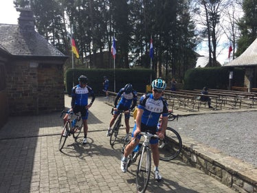 Vandaag de jaarlijkse topdrukte in Limburg, de tourversie van de A.G.R., hetgeen betekent zo snel mogelijk Limburg ontvluchten. Dus meteen de brug over richting Belsj waar onze Nederbelg ons zal opwachten. Ons is, Christian, Pieter, Febian en Joshua, vijf man sterk dus. Uge is er vandaag niet bij hij is een van de 15.000 deelnemers aan de AGR. Hij zal vandaag 175 km afleggen en ruim 2000 HM overbruggen. Super ritje dus. Wij beginnen vandaag eens lekker vlak langs de Maas en Kanaal richting Kanne. Voorbij Kanne neemt Marcel de route over voor een stukkie route touristique. Wel met een aantal hindernissen zoals paaltjes, dwarsliggers, hekjes, en een sluis. Vervolgens snel door Vise en daarna over smalle paden richting Richelle. De bomen staan al in volle bloei en met de zon in de hemel vormt dat een mooi plaatje. We hebben er echter weinig aandacht voor want het tempo ligt redelijk hoog. Vanaf nu loopt het continue iets omhoog en met wat tegenwind gaan we over in de hark stand. Alleen een aantal opengebroken wegen halen ons uit het ritme. Het lijkt wel alsof de Belgen overal bezig zijn, niet dat we dat erg vinden want het is hobbelen in dit deel van België. Als we in Olne zijn aangekomen duiken we naar beneden richting Nessonvaux, waar er kort overleg is over de te volgen route. We besluiten om richting Banneux te fietsen via de traditionele klim, hobbeldebobbel dus, in een tempo dat iedereen aan kan. Eenmaal boven besluiten we naast het klooster te pauzeren. Waarschijnlijk voor de laatste keer want 6 euro voor een stukje vlaai is eigenlijk te gek voor woorden. En het zijn niet meer die stukken van vroeger. Het mooie weer maakt echter veel goed. Marcel is niet te spreken over de hoeveelheid hoogtemeters, nog geen 600, dat kan echt niet, vind hij. Nadat we hebben afgerekend (zonder fooi) willen enkele mannen nog even een kaarsje aansteken. Dit hoort natuurlijk bij een bezoek aan Banneux en iedereen heeft er zijn reden voor. We dalen vervolgens af naar Pepinster en onder aangekomen slaan we links af en fietsen kort langs de Vesdre. Kort, want naar amper 2 km maken we een scherpe bocht naar rechts, de Drolenval doemt voor ons op. 1 km met een max. stijgings% van 18%, een echt rotzakje dus. Al meer dan 8 jaar is ie niet meer opgenomen in de routes maar nu mogen we weer. Hiep, hiep. De groep spat na verloop van tijd uit elkaar al zijn het Pieter, Christian en Febian die zij aan zij omhoog zwoegen. De overige twee mannen komen op een kleine achterstand boven, beide flink vloekend. Nadat we even op adem zijn gekomen vervolgen we onze weg over een mooi en golvend stuk richting Soiron waarna het binnendoor richting Herve gaat. Ook nu zit er weer herhaaldelijk een klim in, tot ongenoegen van Marcel. Eerst klagen over het tekort aan HM en nu mag het wat minder zijn. Het is altijd wat he. Na Herve gaat het, voornamelijk over binnenwegjes, meestal bergaf met slechts af en toe een kort heuveltje. Voordat we de grens oversteken in s-Gravenvoeren nog een stuk onverhard en vervolgens in gestrekte draf vlak terug naar huis. Tempo wordt redelijk hoog gehouden mede door Marcel die zijn goede benen heeft teruggevonden. Zo nu en dan komen we nog een verdwaald deelnemer van de AGR tegen. Vanaf Geulle volgen er weer een aantal plaagstootjes, vooral Pieter lijkt nog wat over te hebben en wil de andere mannen nog wat pijn doen. Moe maar voldaan arriveren we weer op het terras van de Dikke Stein. Alweer dik verdiend die pint. Nagenieten in de zon van de mooi rit.
