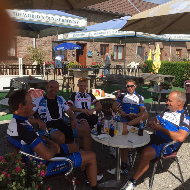 In de tour klaagt men al dagen van saaie, vlakke en warme etappes van meer dan 200 km. De heren profs raffelen deze even af met een gemiddelde van ruim 40km per uur. Hoezo saai, wat moeten wij dan wel niet zeggen. Bij ons geen vroege ontsnapping, geen collectieve plaspauze, geen tussensprints en geen enerverende eindsprints. Nee wij gaan wekelijks in een gezapig tempo (althans voor profbegrippen) op pad voor een etappe van om en nabij de 130 km en je hoort ons niet klagen. Wat toeschouwers aan de kant die jouw naam scanderen zou leuk zijn maar het zou alleen maar afleiden. Zo ook vandaag, nauwelijks publiek bij de start, enkel Els die de eerste meters van de etappe steentjes vrij bezemt. Na een korte neutralisatie van amper 400 meter kunnen we weer aan onze eigen touretappe beginnen, een korte overgangsrit met nauwelijks vlakke wegen en een aantal venijnige heuveltjes zal er op de planning staan. Omdat Febian vandaag wat op tijd thuis wil zijn is de starttijd met een half uur vervroegd. Bij de Meule zijn ze flexibel en houden we zoveel mogelijk rekening met de wensen van eenieder. Gelukkig bestaat ons pelotonnetje vandaag uit een even aantal van 6 personen. Marcel, Roger, Febian, Nico, Christian en Pieter. Twee aan twee in een strak tempo via voornamelijk binnenwegjes richting Voerendaal. Tijdens een kort klimmetje richting Ransdaal krijgt Roger het moeilijk. Hij heeft zijn dag niet, gisteren een rustige duurtraining gemaakt naar Banneux van dik 130 km. Hij besluit dan ook om even voor Colmont af te draaien. De overgebleven mannen zetten nu koers richting Bocholtz met iets later een kort uitstapje naar Duitsland. Als we weer op Limburgse bodem aankomen kunnen we direct beginnen aan de klim richting het Drielandenpunt. Zoals gebruikelijk valt de groep even uit elkaar. Na de hergroepering dalen we af naar Gemmenich. Daarna gaat het nog steeds in dalende lijn naar Sippenaeken. Omdat de “Soigneur” nog gesloten is fietsen we door naar het iets verderop gelegen Kuttingen om daar plaats te nemen op het terras van ”Hoeve de Eik”, met waarschijnlijk een van de mooiste uitzichten over Limburg. We krijgen de cola met een rietje ofwel “une paille”, ja dit hebben we nog onthouden. Volgens de serveerster wordt dit gedaan voor de bijen, logisch toch heb nog nooit een bij een flesje zien optillen. Nico neemt als enige geen vlaai, het stuk dat hij gisteren tijdens zijn fietstocht heeft genuttigd ligt hem nu nog zwaar op de maag. (meer slagroom dan vlaai). Nadat Marcel zijn bedevaart voettocht naar het toilet erop heeft zitten en we hebben afgerekend mogen we zoals gebruikelijk weer aan een klim beginnen, gevolgd door de afdaling naar Teuven, waarna al snel de volgende klim volgt. Ook nu is echt geen vlakke meter te vinden. Lange (klim naar Ulvend) en korte venijnige klimmetjes volgen elkaar snel op. Via St-Geertruid gaat het binnendoor naar Berg en Terblijt en Meerssen. Pas als we langs het vliegveld fietsen mogen we even genieten van een vlakke weg en rugwind. Heerlijk. Met nog 10 km te gaan zou normaal gesproken de finale in gang schieten maar vandaag blijft het rustig. Het was immers een pittig ritje met toch de nodige hoogtemeters. In een aangenaam tempo fietsen we richting Elsloo waar alles al is klaargemaakt voor Carnaval Mundial. Gelukkig kunnen we toch nog op het terras van de Dikke Stein plaatsnemen. Was het een saaie rit, nee ons hoor je niet klagen het was weer een mooie zonnige fietsdag over een afwisselend parcours.